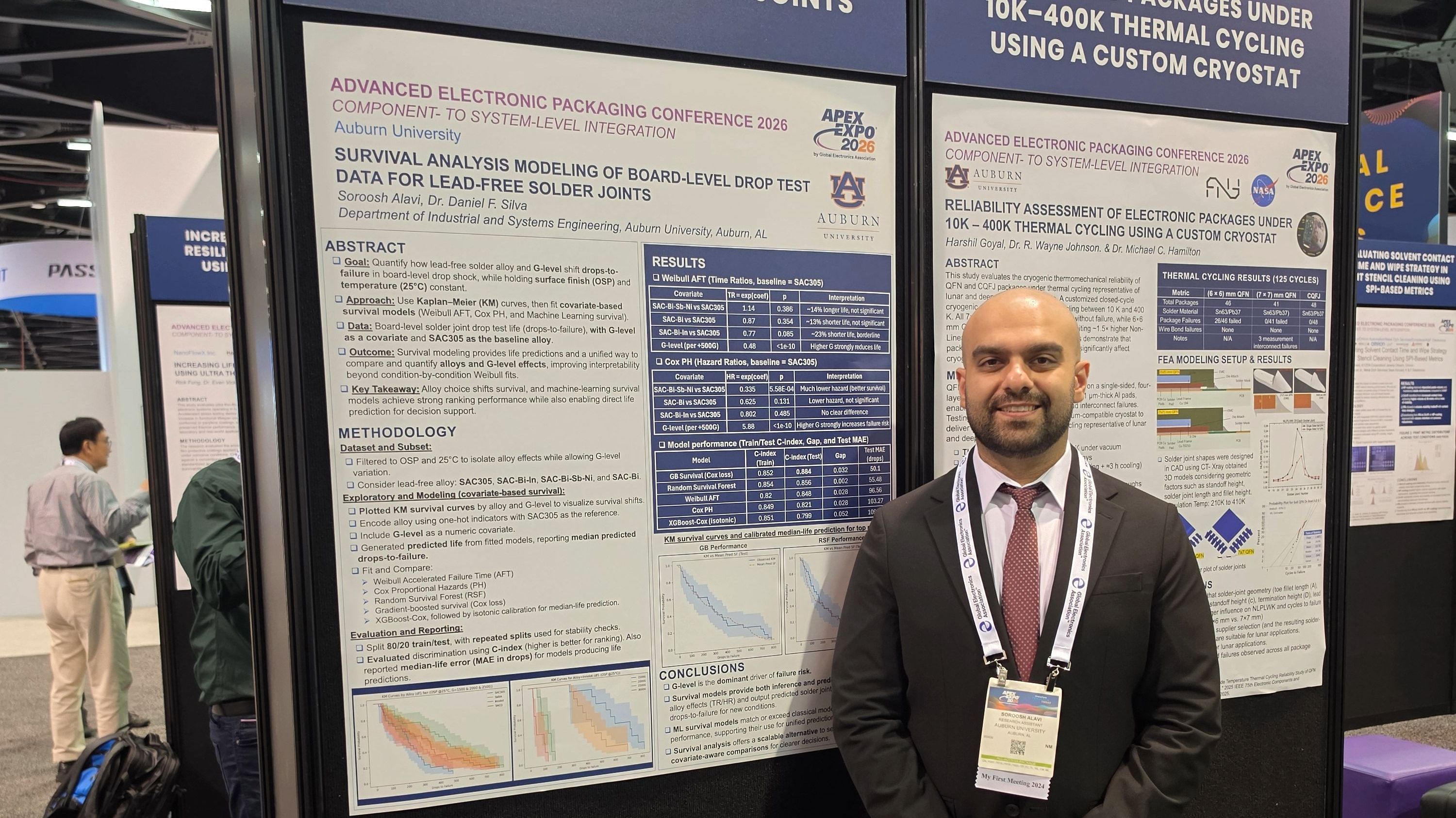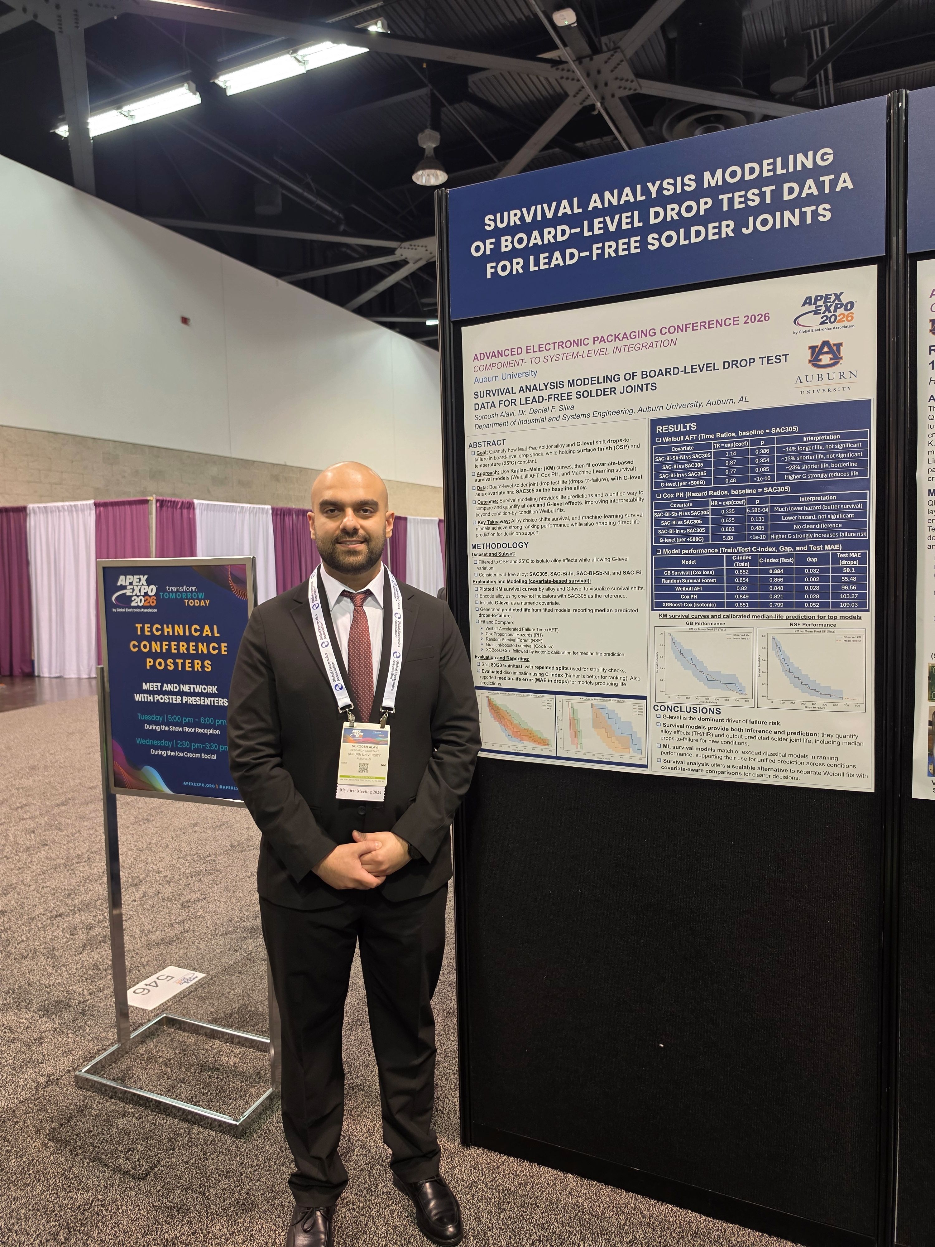 Soroosh: My name is Soroosh Alavi, and I am a PhD student in Industrial and Systems Engineering at Auburn University. My research focuses on electronics reliability, especially solder joint reliability, where I use data science, machine learning, and survival analysis to better understand failure behavior and improve life prediction. Looking ahead, I hope to build a career in data science, AI, and machine learning engineering, ideally in areas related to electronics manufacturing, reliability, and intelligent industrial systems.